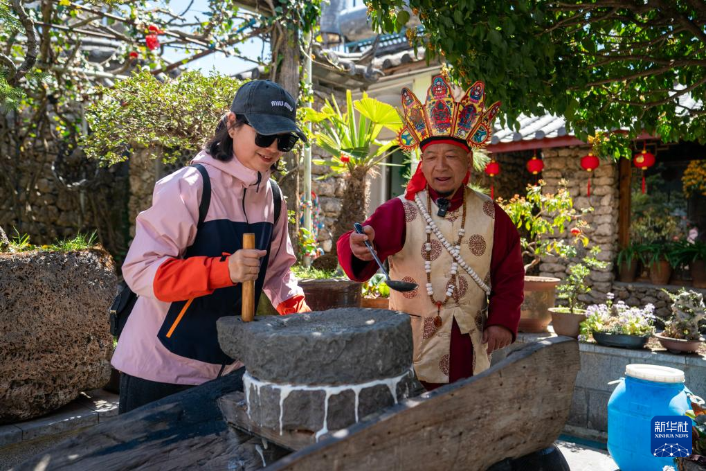 2020年6月,和杰林把自己家的传统老宅修缮一新,改造成为村里第一家纳西文化体验馆,带着进村的游客参观老宅,体验磨豆花、制作东巴纸、穿纳西服饰等活动,分享老物件背后的故事,介绍院子里蕴含的纳西文化。
