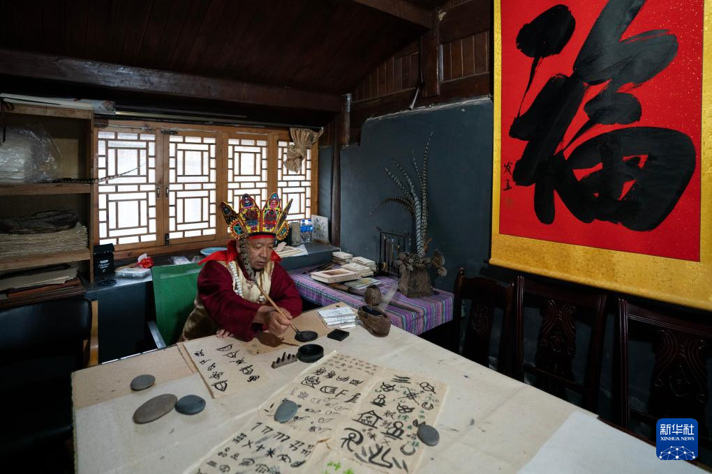 和杰林在家中书房内书写东巴象形文字(3月25日摄)。