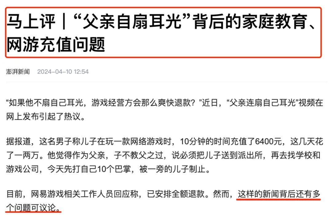 几乎同一时间,“男孩玩游戏充值上万元父亲连扇自己耳光”一事引发全网热议,这位父亲带着儿子跑到网易总部讨要说法。