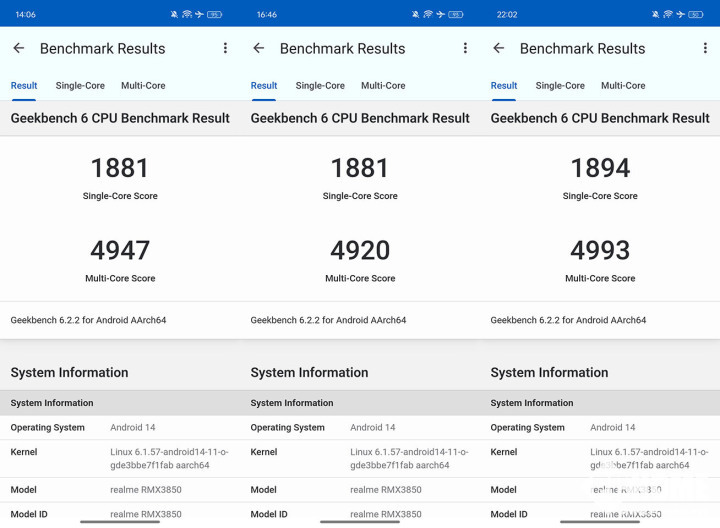 偏重CPU性能的GeekBench6上,真我GT Neo6 SE表现也非常稳定,单核成绩1880分左右,多核成绩不到5000分。值得关注的是单核成绩,与第二代骁龙8的表现非常接近。从跑分成绩上来看,真我GT Neo6 SE有着不俗的性能表现,相比上一代的GT Neo5 SE,在X4超大核的加持之下,性能和能效都得到了大幅度的提升,与真正旗舰手机的差距进一步缩小。