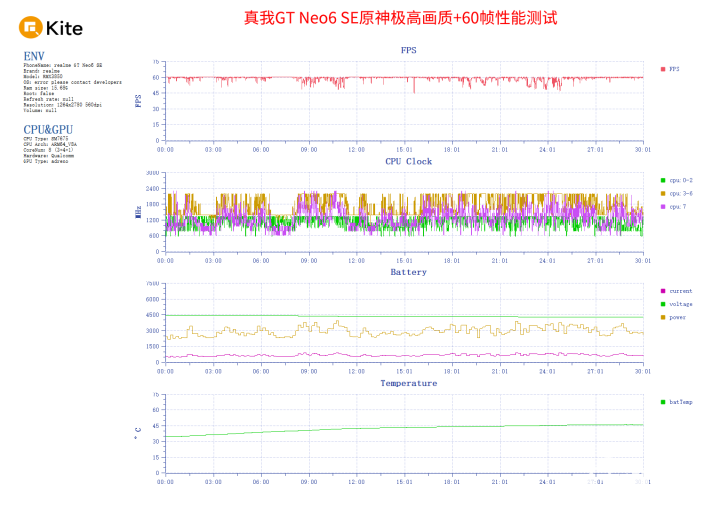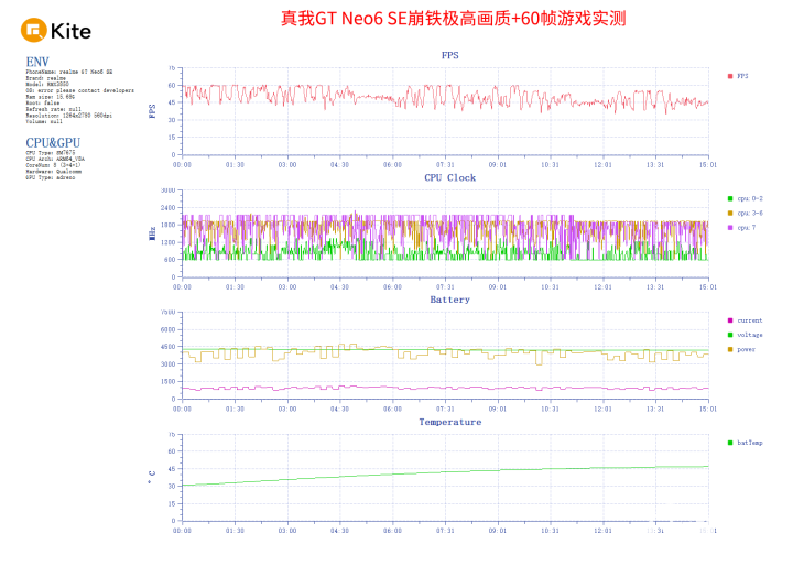 在负载更高的崩铁中,真我GT Neo6 SE在15分钟长乐天跑图场景平均帧率49.9帧,帧率曲线并不那么稳定了,在高负载场景下会限制帧率到45帧。游戏功耗较高,高达7.9W;发热也很高,正面最高温48.2度,背面最高温49.8度。