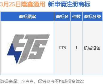 证券之星消息,根据企查查数据显示,近日隆鑫通用动力股份有限公司新提交“ETS”商标注册申请。商标申请详情如下: