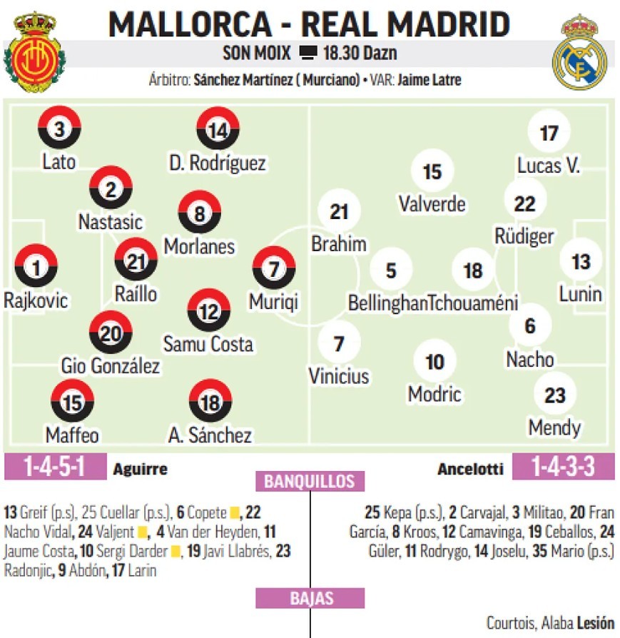 马略卡首发:1-拉伊科维奇、3-托尼-拉托、2-纳斯塔西奇、21-赖洛、20-乔瓦尼-冈萨雷斯、15-巴勃罗-马菲奥、14-达尼-罗德里格斯、8-莫拉内斯、12-萨穆-科斯塔、18-安东尼奥-桑切斯、7-穆里奇。