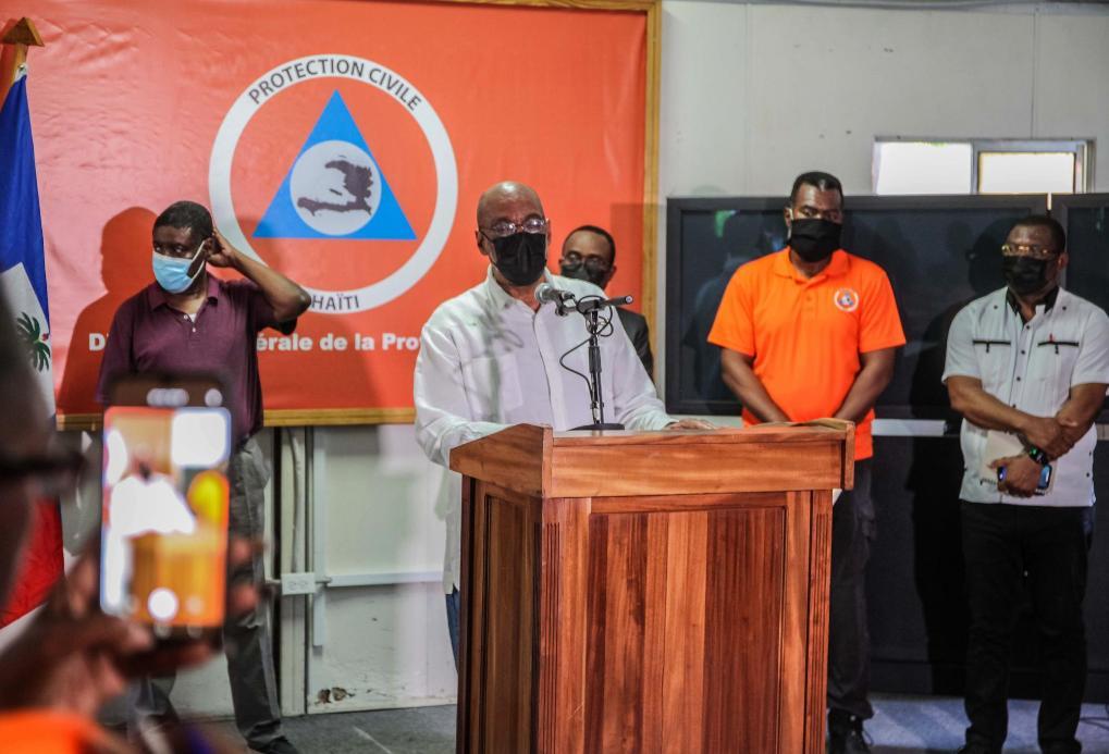 2021年8月14日,海地总理亨利(前)在太子港举行的新闻发布会上讲话。新华社发(理查德·皮耶林摄)