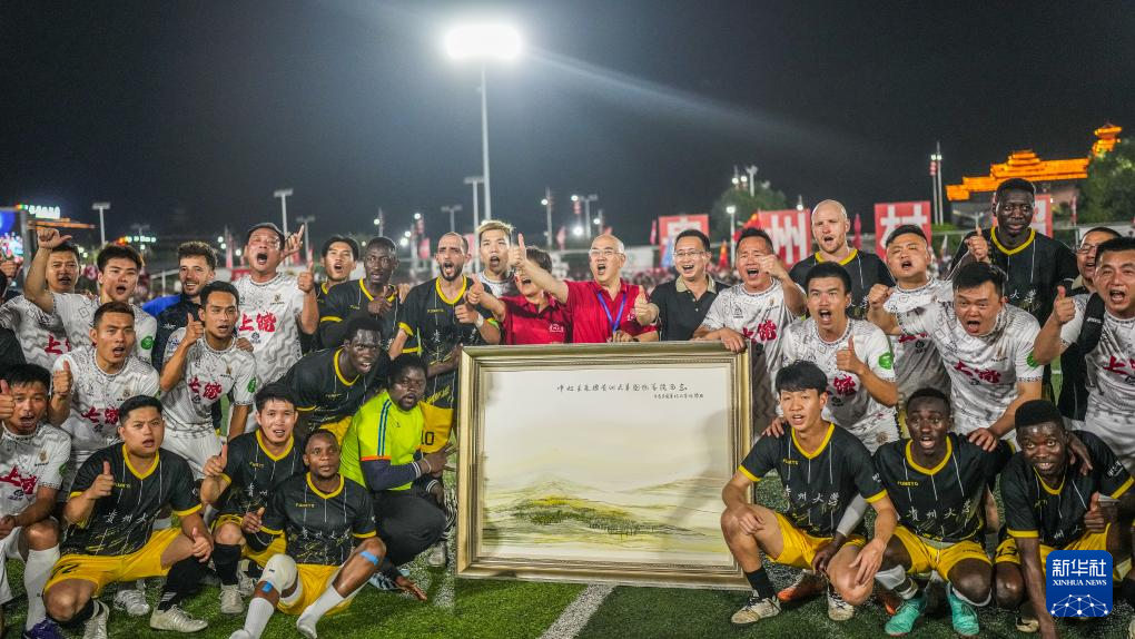 4月13日,贵州大学国际学生足球队和上饶渣渣灰江西米粉足球队成员在赛后合影留念。
