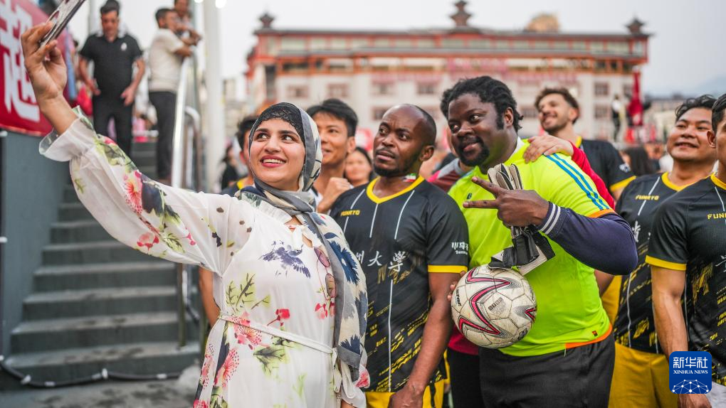 4月13日,一名女留学生和贵州大学国际学生足球队球员自拍合影。