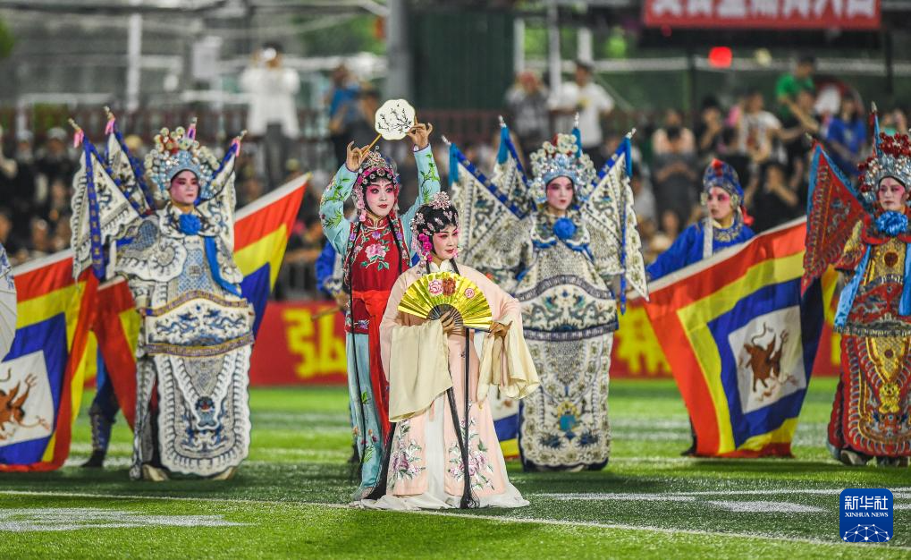 4月13日,上饶渣渣灰江西米粉足球队的助威团在中场休息时进行表演。