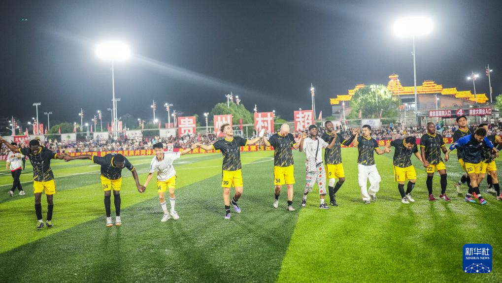 当日,在贵州省黔东南苗族侗族自治州榕江县“村超”足球场,贵州大学国际学生足球队对阵上饶渣渣灰江西米粉足球队。
