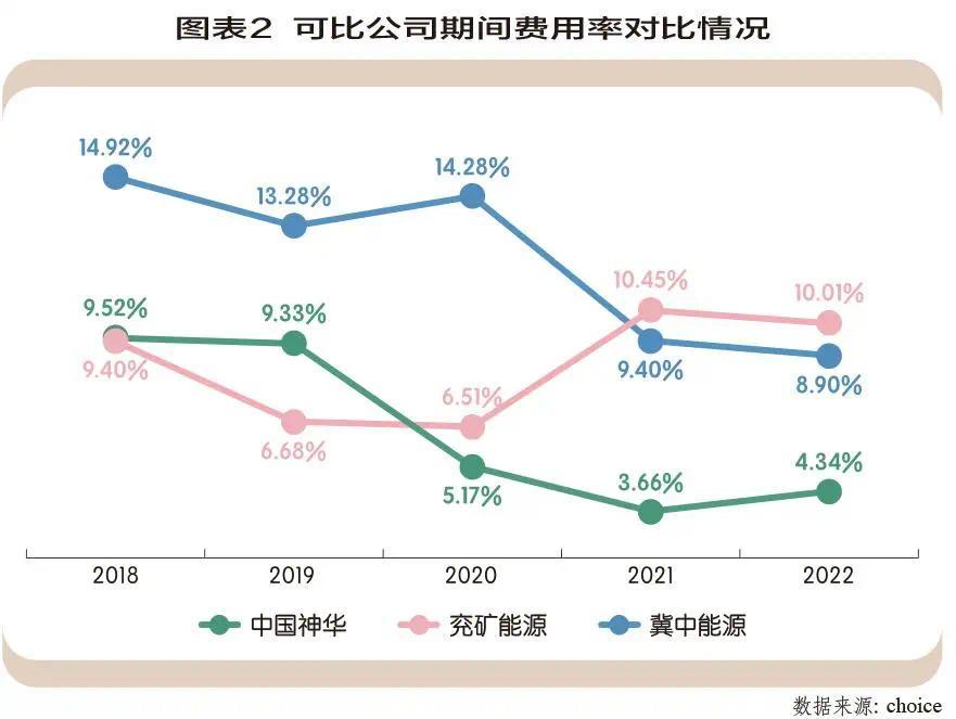 中国神华的费用管控能力较强,2022年销售费用率、管理费用率、财务费用率分别为0.12%、2.88%、0.25%,三费保持在较低水平。如图表2 所示,2018-2022年期间,中国神华的期间费用率从9.52%下降至4.34%,成本端费用管控能力逐步增强。在与可比公司兖矿能源、冀中能源对比中发现,2020年开始,中国神华的期间费用率管控就开始要好于可比公司,2022年兖矿能源、冀中能源期间费用率分别为10.01%、8.90%,落后中国神华5.67个百分点和4.56个百分点。