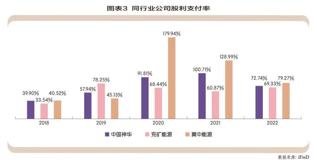 如图表3所示,根据iFinD数据,2018-2022年,中国神华的股利支付率均保持在较高的水平,平均股利支付率为72.62%,并且在2019年开始,其股利支付率有着明显的提升趋势,而同行公司兖矿能源、冀中能源的股利支付率整体也维持在较高水平区间,侧面反映出中国神华所处的行业大部分保持高股利支付率。