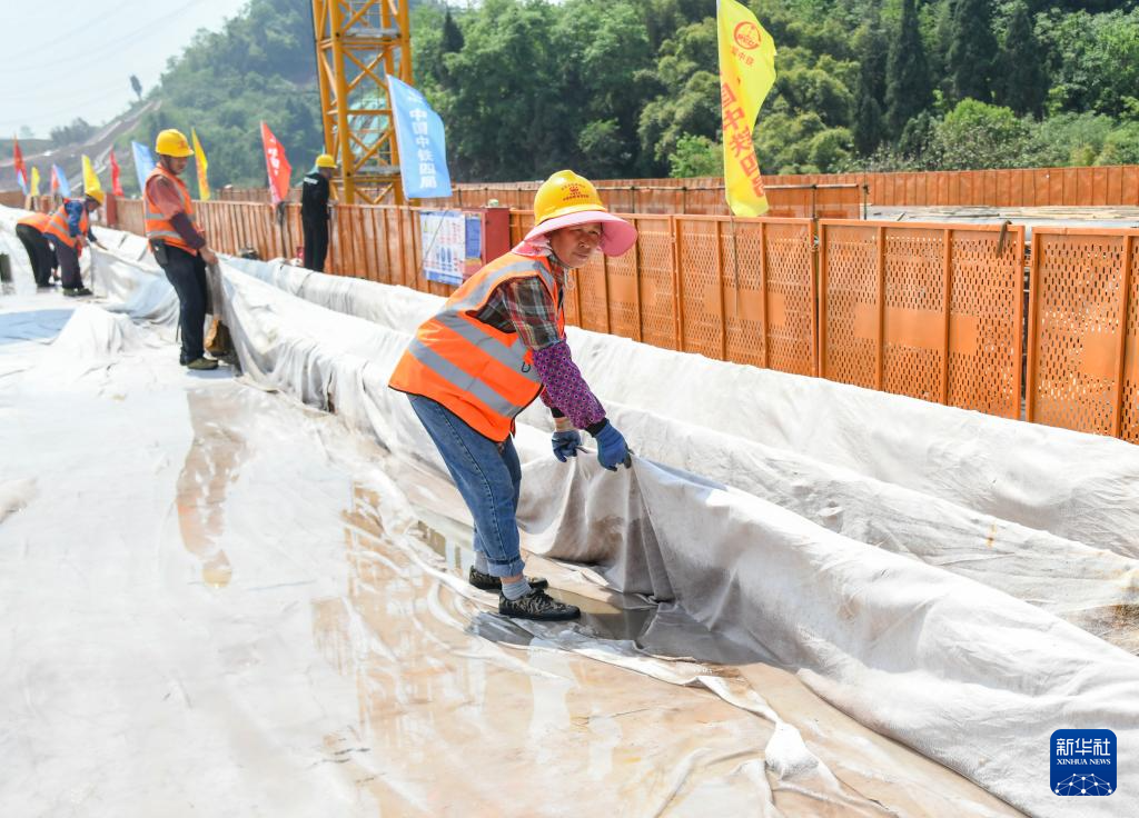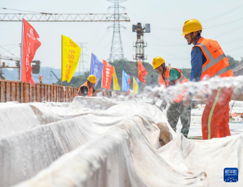4月14日,在四川省达州市境内的达州南站2号八线特大桥连续梁建设现场,中铁四局的工人在进行混凝土养护施工。