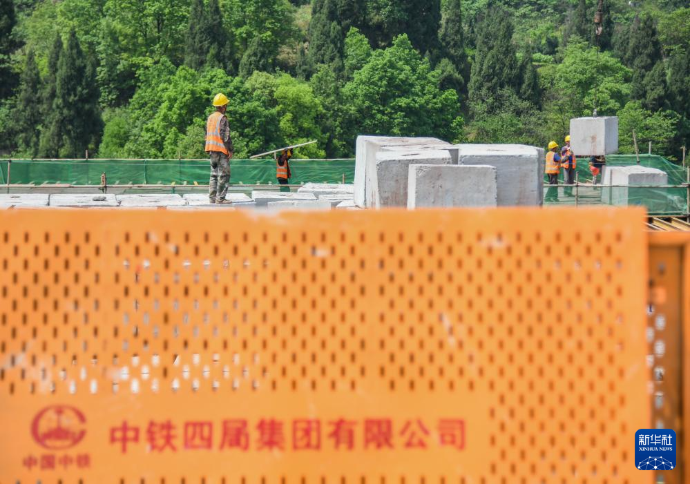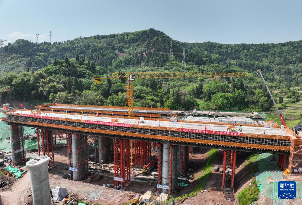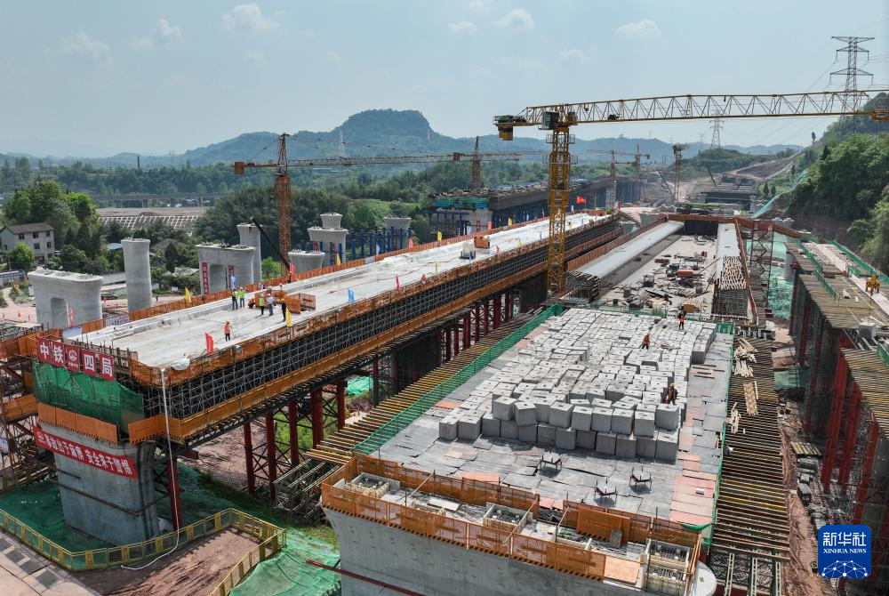 这是4月14日在四川省达州市境内拍摄的达州南站2号八线特大桥连续梁建设现场(无人机照片)。