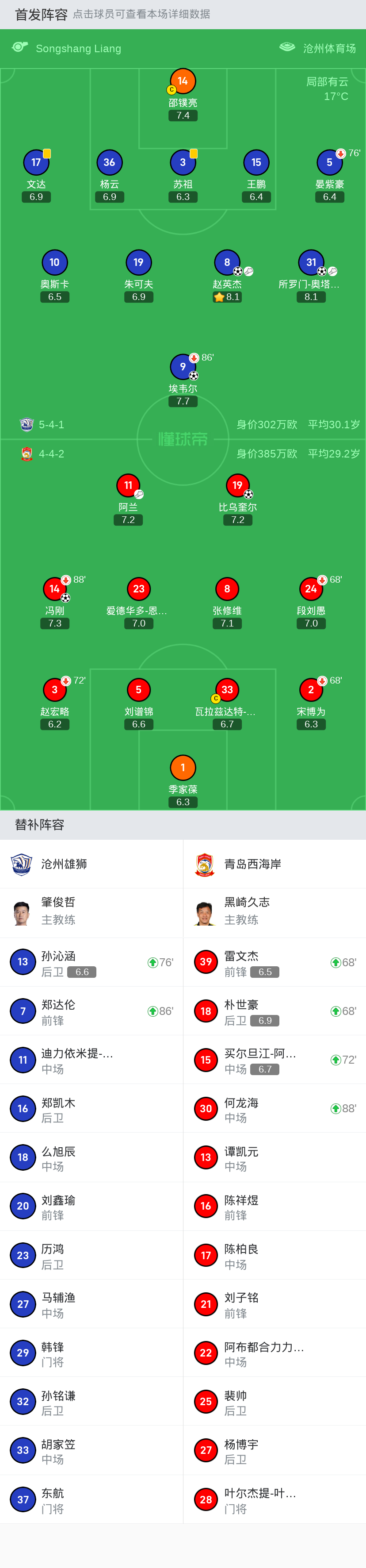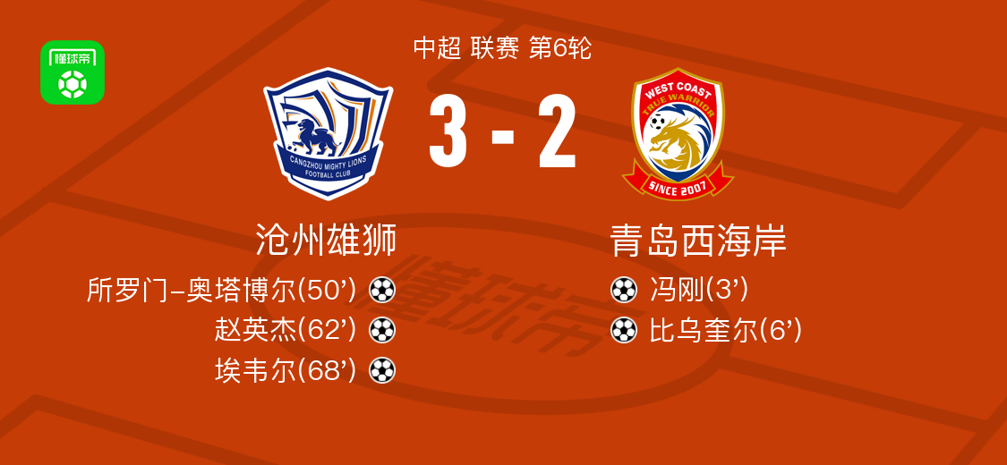 北京时间4月14日中超 联赛 第6轮,沧州雄狮主场对阵青岛西海岸。沧州雄狮所罗门-奥塔博尔破门,赵英杰破门,埃韦尔破门。青岛西海岸冯刚破门,比乌奎尔破门。最终比分沧州雄狮 3-2 青岛西海岸。