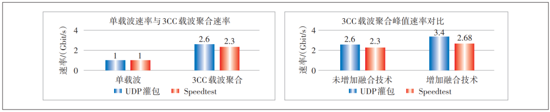 UDP灌包测试:3个终端分别接入3.3/3.4/3.5 GHz单载波,关闭CA功能,3个载波同时下行UDP灌包,峰值测试仅能达到1 Gbit/s左右,其中3.4 GHz现网存在同频干扰速率为800 Mbit/s左右,3个终端下行速率合计为2.9 Gbit/s。