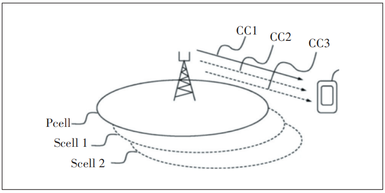 在3载波聚合场景中,UE可同时使用3个载波。3个载波中,有1个载波称为主载波(Primary Component Carrier,PCC),PCC对应的小区称为PCell。另外2个载波称为辅载波(Secondary Component Carrier,SCC),SCC对应的小区称为SCell。