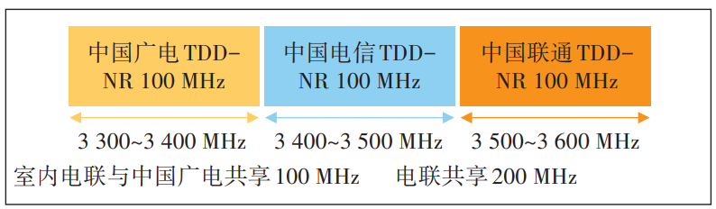 电联共享的200 MHz 5G频谱及中国广电共享的100 MHz 5G频谱为3.3~3.6 GHz,共计300 MHz连续的频谱资源。根据3GPP低频频段内连续载波聚合规范(对应协议3GPP TS 38.101-1 的Table 5.5A.1-1),NR支持CA_n78D(100+100+100)形式的3CC载波CA组合。因此中国电信、中国联通和中国广电300 MHz频谱适合组成带内连续CA,是极其理想的载波聚合方式(见图1)。