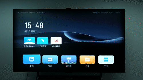 主界面桌面右上角会显示TCL办公智屏自带的无线热点,账号密码都提供,方便与会者连接,可上网或无线投屏,是非常人性化的实用功能。