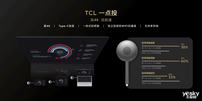 4K投屏器机身只有1个Type-C接口,1个投屏按键,使用相当简单,在将投屏器插入TCL办公智屏配对后,即可将投屏器插入电脑、平板、手机,之后投屏键开始闪烁,此时按下即开始投屏。