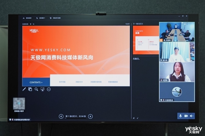 远程会议中,我们可以使用电脑共享PPT,把PPT画面分享给各地的与会者观看;如果是本地会议,TCL办公智屏单纯作为演示屏幕使用,我们则可以使用无线投屏或投屏器投屏,把PPT投到智屏上给现场与会者观看,显示效果更好。