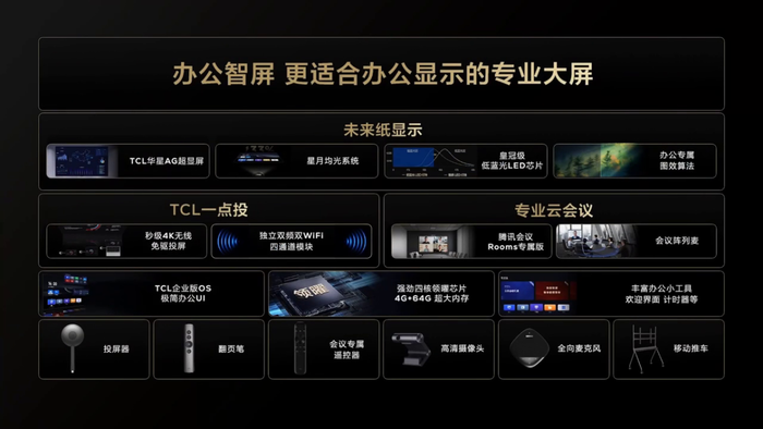TCL办公智屏最大的亮点是未来纸显示技术,它包含TCL华星AG超显屏、星月均光系统、皇冠级低蓝光LED、办公专属图效算法,专为办公优化,适合会议长时间的观看。