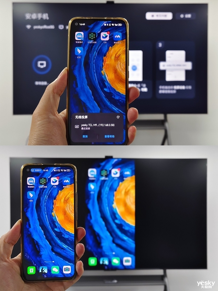 手机在系统下拉栏按投屏键,搜索到TCL办公智屏后,点击即可连接投屏。