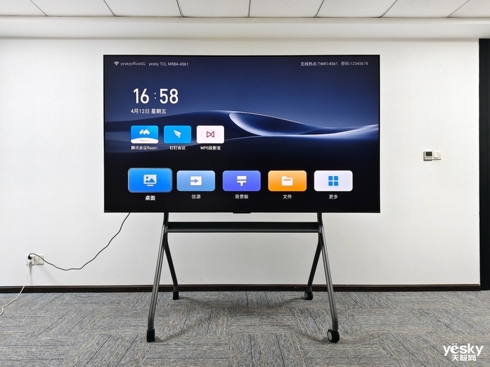 TCL办公智屏拥有多种尺寸。55”版采用旋转底座,适合总经理办公室、独立会议室,三五人的快速会议。75”以上的大尺寸则适合多人会议室,可以挂装也可以搭配移动推车。在我们评测室的这台是98吋的TCL M98A。