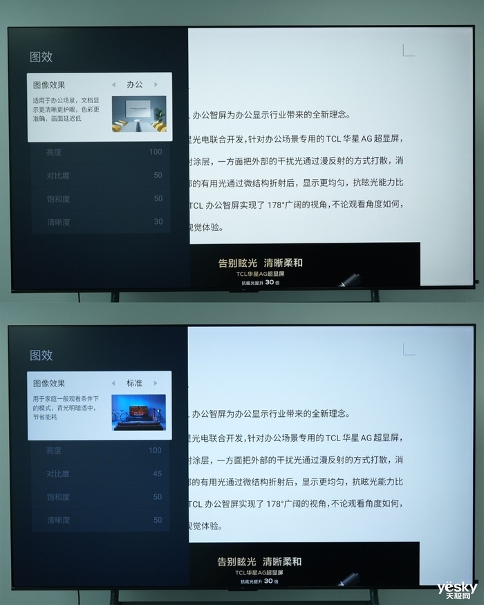 从用眼体验上看,“办公”图效色温稍暖,看起来比较柔和;“标准”图效则可看出稍微偏蓝,蓝光较多。另外还有“电影”图效,色彩较鲜艳;“明亮”图效,整体高亮。
