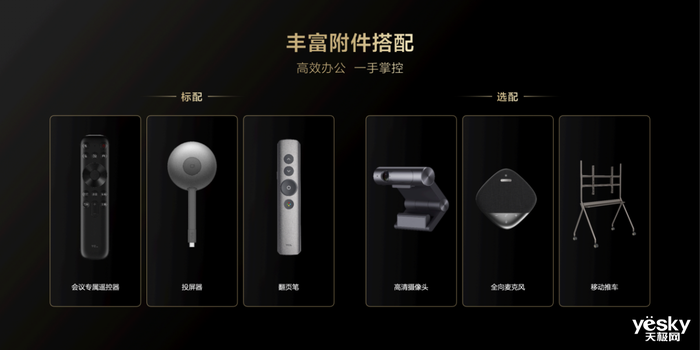配件方面,TCL办公智屏标配的有投屏器、翻页笔、会议遥控器。可选配的有:高清摄像头、全向麦克风、移动推车。