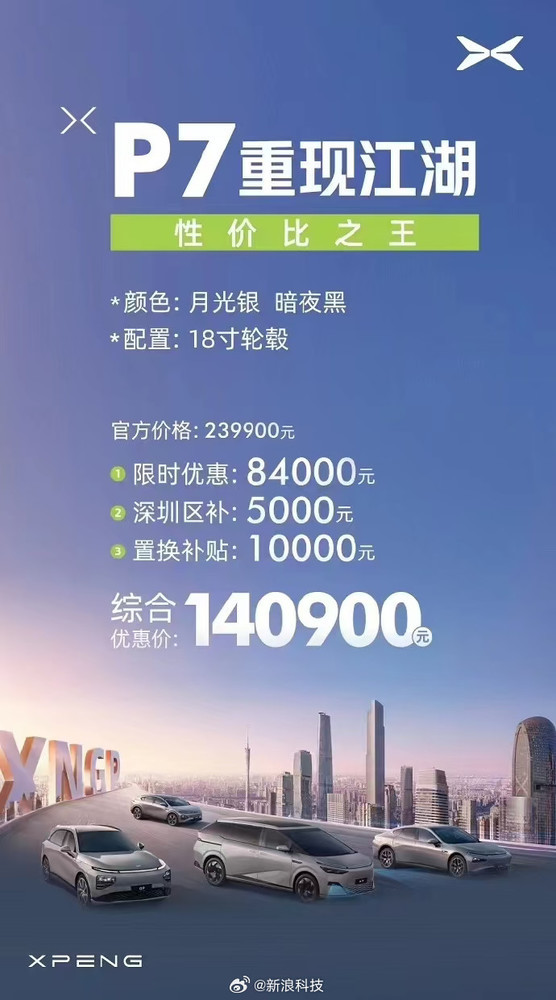 近日,一张“P7重现江湖”的海报图在网上流传。海报显示,小鹏P7限时综合优惠后,只要14.09万元就可拿下。其中包括高达8.4万元的限时优惠,5000元的深圳区补以及10000元的置换补贴。加起来综合优惠可达9.9万元。不过,海报显示这个限时优惠仅限月光银和暗夜黑两个配色,搭配的是18英寸轮毂。