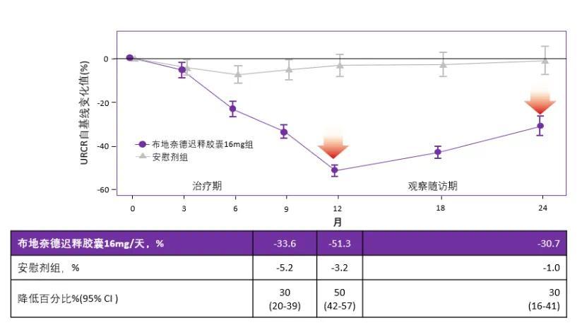 我们可以看到第12个月(即停药后的第3个月),右侧红框所示,才是布地奈德肠溶胶囊整体展现最大效果的时候!耐赋康®NEFECON®组相对安慰剂组降低了49.7%的尿蛋白。
