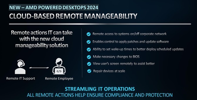 AMD PRO的可管理性,一个非常重大的亮点,就是把过往基于云端的支持进一步延伸到了台式机上,对于所有的用户,包括那些远程办公的用户,还有混合办公的用户,是一个非常重要的特性,这意味着IT支持的人员可以为远程或者混合式办公的员工提供及时的IT支持。它可以简化整个IT的运维,而且也允许IT的支持人员来采取一些必要的行动,而以往这种行动如果说对方没有在同一个网络里的话是无法实现的。