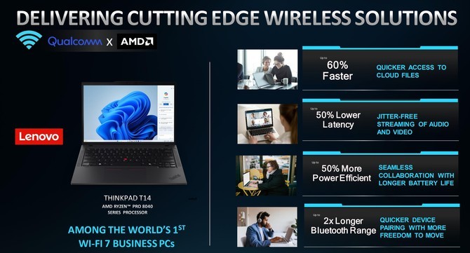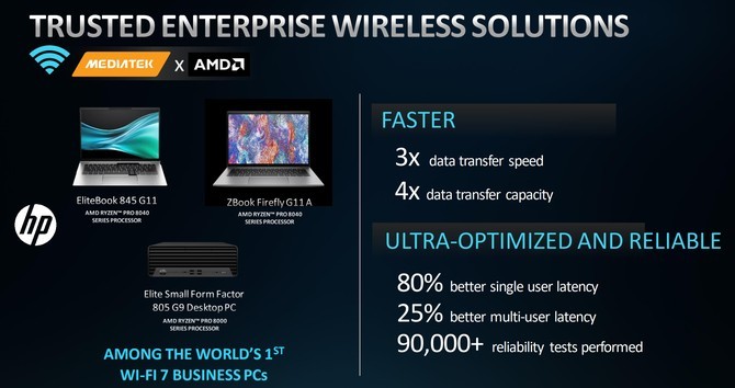 最后,Ronak Shah还介绍了AMD跟高通、联发科的技术合作,比如通过跟高通的合作,帮助联想实现了全球首批搭配WiFi 7无线网络的商用PC产品,这可以提供更快的速度、低延迟、低功耗,而且5.4蓝牙支持,连接的范围更大。另一个是跟联发科的,目前也已经应用在惠普的商用PC上,带来全球首批搭配WiFi 7无线网络的产品。