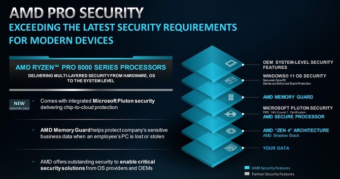 具体看看AMD PRO Security安全性。无论是针对移动产品的市场,还是台式机的市场,AMD都满足了现在最 新的最严格的在安全方面的要求。此外,AMD还跟微软Microsoft Pluton安全的产品进行了整合,不管是移动端的产品还是在台式机的产品,都能确保每一个提供给用户的芯片上面都可以实现更好的安全性。