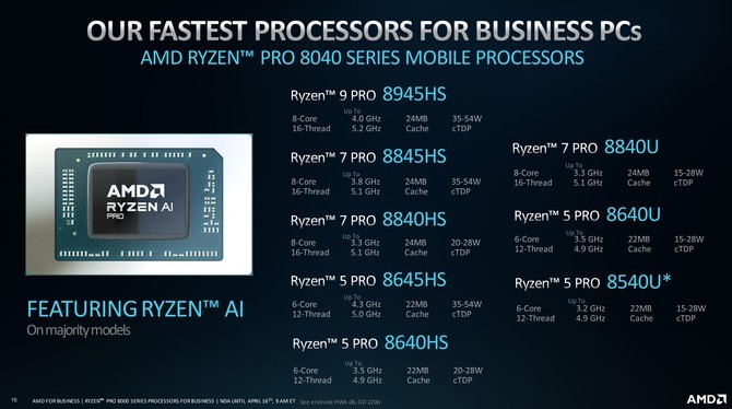 北京时间4月16日,AMD宣布推出面向商用的锐龙PRO系列客户端产品,包括商用笔记本或移动工作站的锐龙PRO 8040系列处理器,以及商用台式机的锐龙PRO 8000系列处理器。除了基于领先的4nm制程、强大的Zen 4架构以外,还首次将AMD Ryzen AI引擎的支持延伸到了台式机上,带来更高的能效比体验。