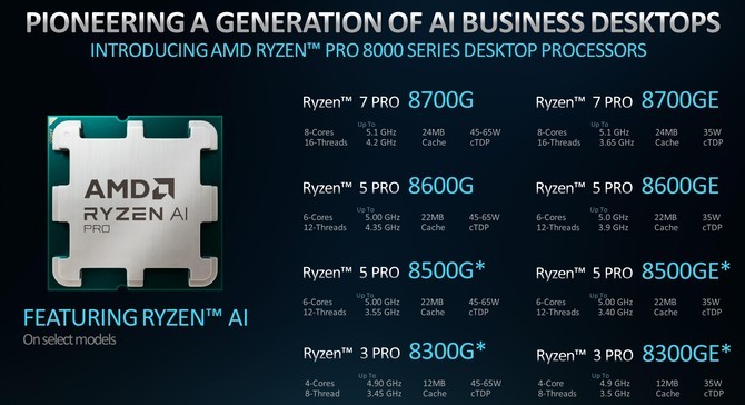 针对商用台式机的锐龙PRO 8000系列,功耗范围45W-65W和35W,分别包括锐龙PRO 8000G 和锐龙PRO 8000 GE两个系列,包括锐龙7 PRO、锐龙5 PRO 和锐龙3 PRO三个型号,最 高的是 8核心16线程,最 低的是 4核心8线程。都是第 一次将Ryzen AI 集成到商用PC端。