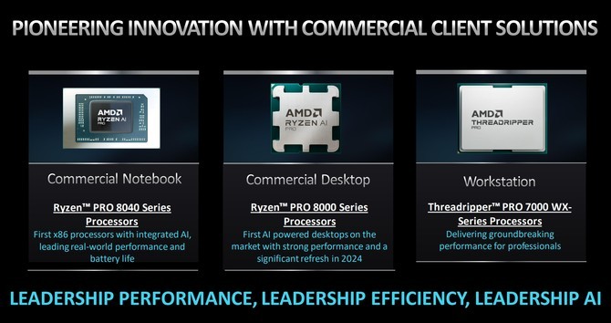 在商用笔记本端,AMD锐龙PRO 8040系列处理器实现了巨大创新,能提供卓越的性能,而且它的电池续航时间也很长。台式机所搭载的锐龙 PRO 8000系列处理器,是第 一款由AI驱动的商用台式机的产品。工作站的产品是Threadripper Pro 7000 WX系列的处理器,在内容创建和AI工作流的高效处理方面,能够为用户提供非常强劲的性能。