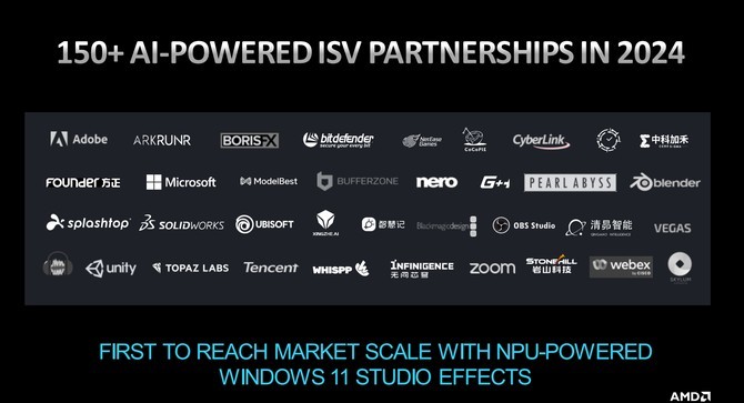 在刚刚结束的AMD AI PC创新峰会上,AMD就表示到2024年底,AMD将会和超过150个ISV实现基于由AI驱动的合作,其中既包括像Adobe、微软、ZOOM等国际性的合作伙伴,也有中国本地的ISV合作伙伴,能够使最终用户在AI时代的使用体验上实现差异化。
