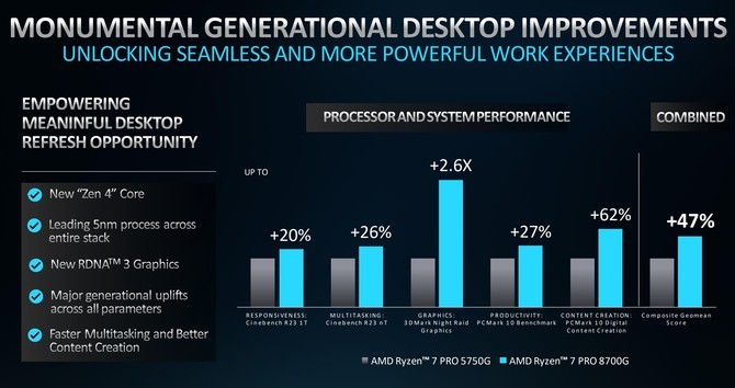 锐龙PRO 8000系列采用4nm工艺,Zen 4核心架构,集成RDNA 3架构的显卡,对比上一代的锐龙7 PRO 5750G,同样在响应速度,还是多任务处理、图形、生产率、内容创建等方面,都有很大提升。