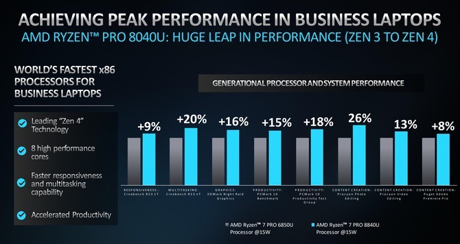 新一代的锐龙PRO 8040系列采用Zen 4架构,相比前一代的锐龙7 PRO 6850U在性能上有着很大提升,包括响应速度、多任务处理、生产效率、内容创建等,都是得益于Zen 4架构优秀的性能。