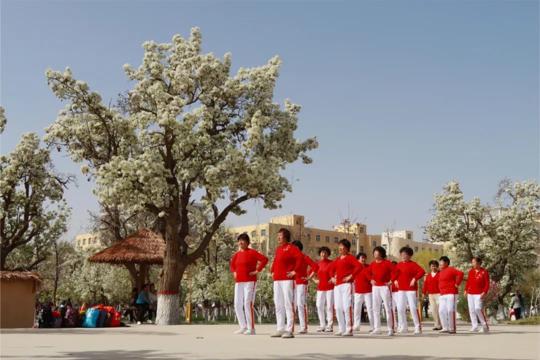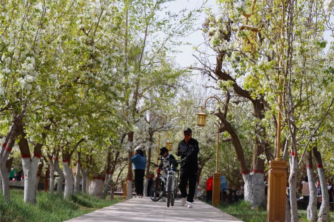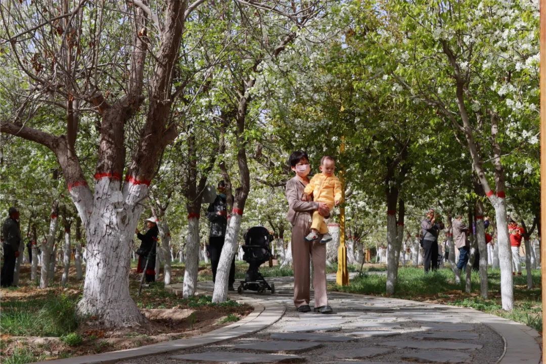 甘州区胡家园子的百年古梨园也迎来最佳观赏期,一簇簇梨花缀满枝头,花开满树好似粉妆玉砌。清风徐来,花香四溢,好一派美不胜收的人间春景。走进梨园,在一片欢声笑语中,只见广场舞爱好者在这里表演舞蹈,市民扶老携幼在这里踏青赏花,市民三五成群相互拍照,享受着春天的温暖和美好。上午十点,市民刘晓燕带着父母和孩子一起来赏花春游,一家人拿着手机不停拍照、拍视频。“这个梨园挺好的,冬天的时候没地方带孩子去玩,现在梨花开了,就带他出来多感受一下,让他知道花是怎么开的,草是怎么绿的,晒晒太阳补补钙挺好的。”刘晓燕说。