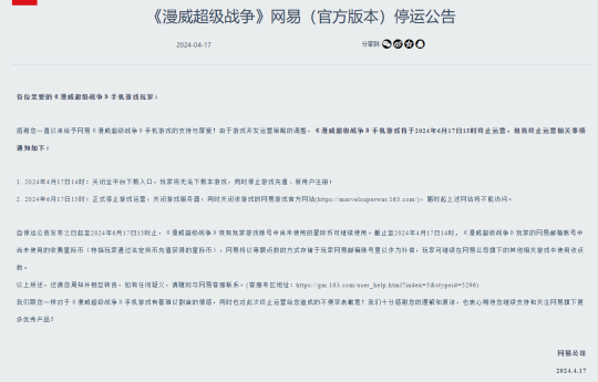 网易《漫威超级战争》宣布将于2024年6月17日15时终止运营并关闭游戏服务器。现在已关闭全平台下载入口,停止游戏充值、新用户注册。