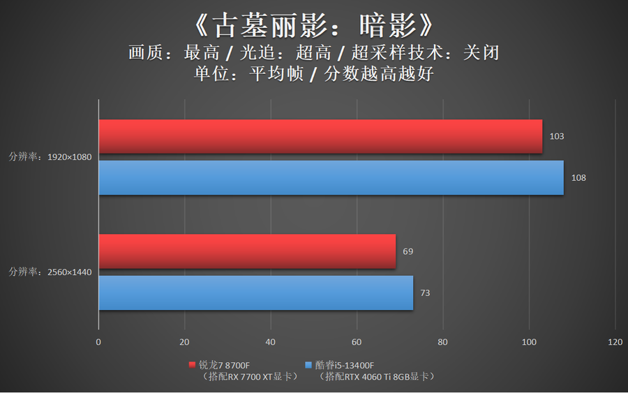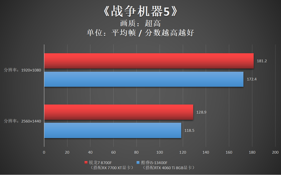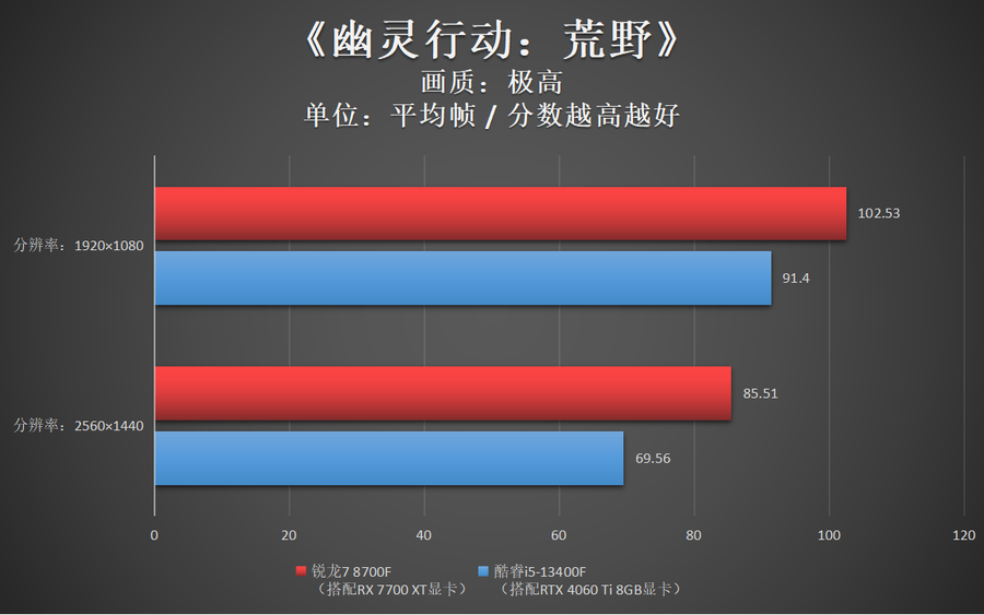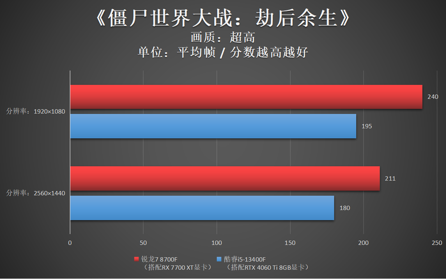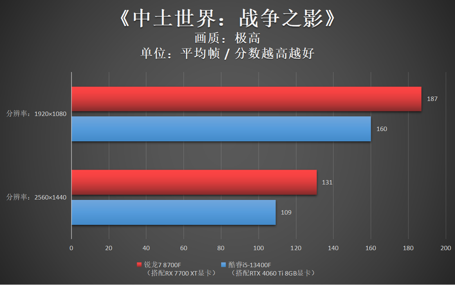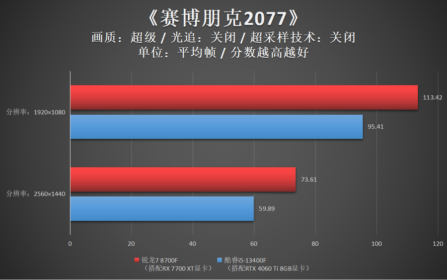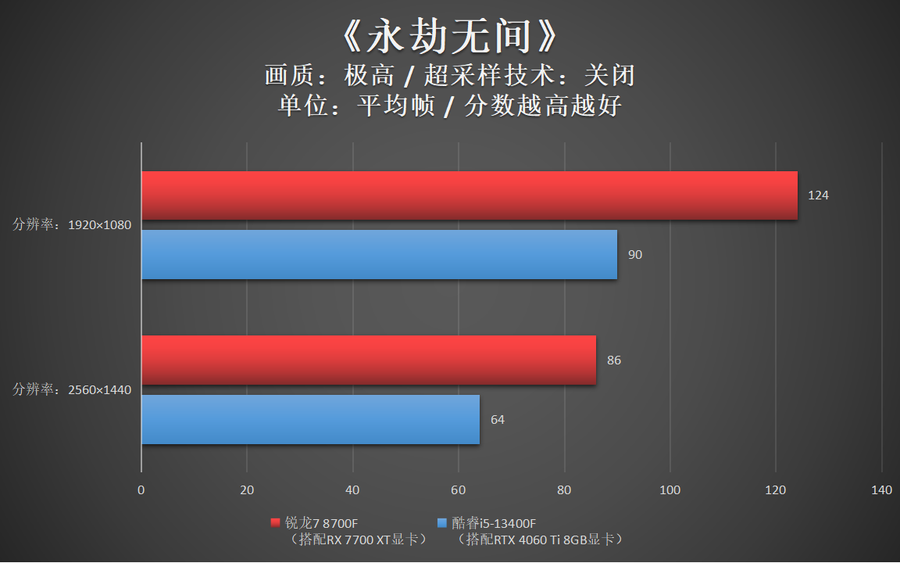 整机游戏性能测试小结:在多数游戏当中,锐龙7 8700F处理器+RX 7700 XT显卡这套组合的表现均要明显优于酷睿i5-13400F处理器+RTX 4060 Ti 8GB显卡这套组合。