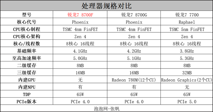 相比锐龙7 8700G,全新的锐龙7 8700F除了减少了内建GPU之外,还有哪些区别?笔者下面制作了一张处理器规格对比表格,大家一看便知。