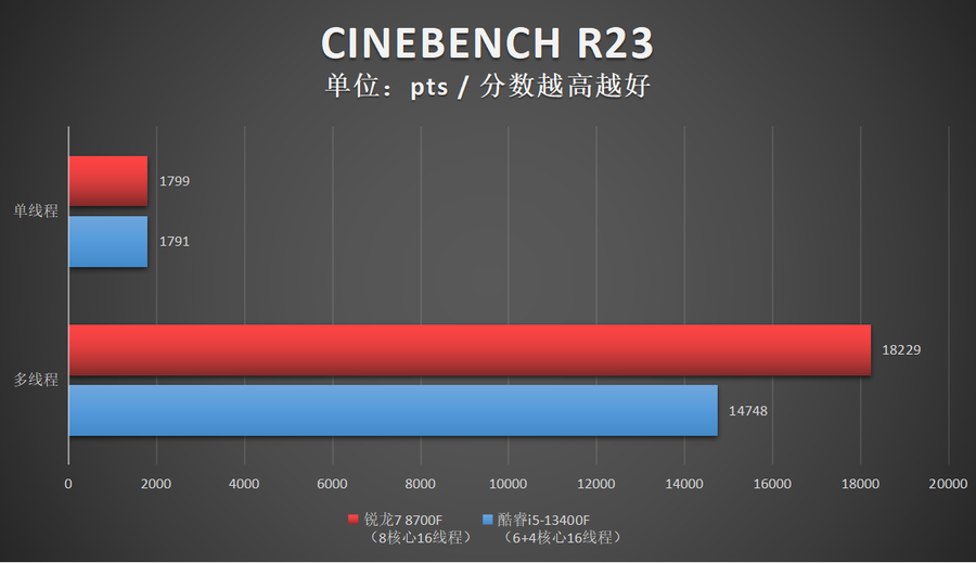 但是在多核心性能方面,别看酷睿i5-13400F核心数量更多,表现却明显不如锐龙7 8700F。