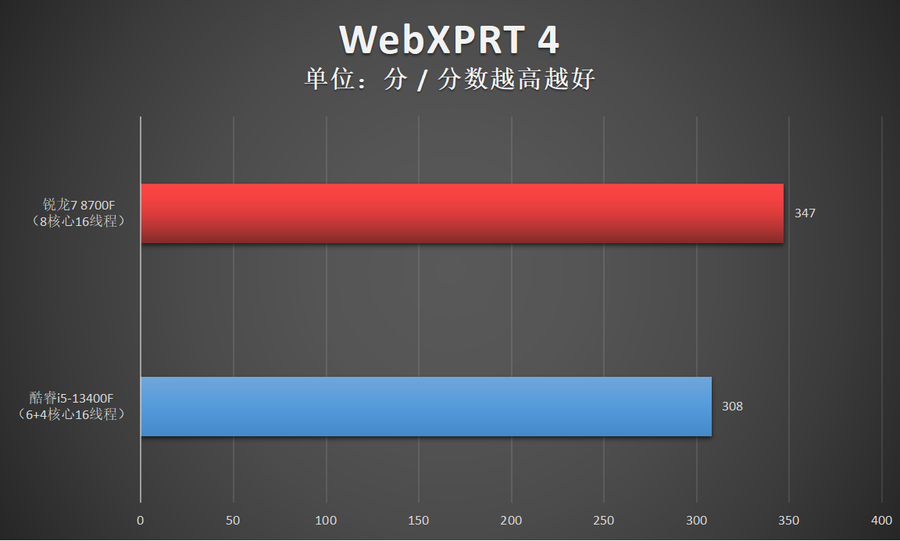 为什么会这样?锐龙7 8700F是实实在在的8个纯大核设计,而酷睿i5-13400F采用的是混合架构设计,6+4核心。当今大多数软件,几乎都是对纯大核CPU优化得更好,这就是笔者的观点。