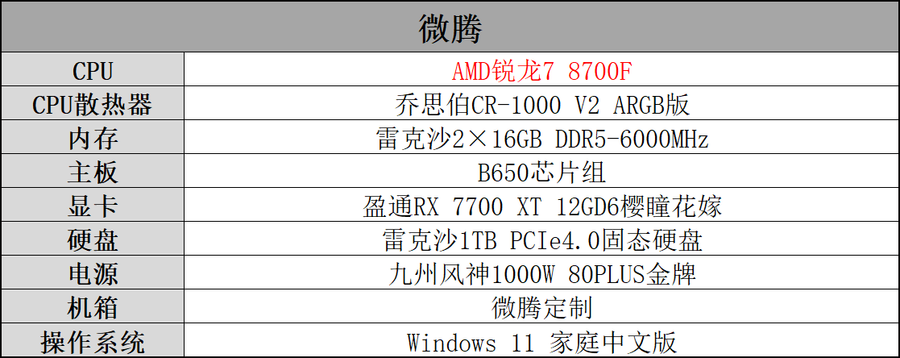 这款微腾主机拥有锐龙7 8700F处理器+B650芯片组主板+RX 7700 XT显卡的3A组合。