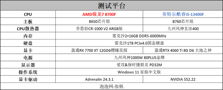 为何要给竞品英特尔平台选用RTX 4060 Ti 8GB显卡?这是因为RX 7700 XT和RTX 4060 Ti 8GB都是目前显卡市场上3000元价位段的主销型号。RX 7700 XT更多常见于AMD平台主机,而RTX 4060 Ti 8GB更多常见于英特尔平台主机。为酷睿i5-13400F的测试平台搭配RTX 4060 Ti 8GB显卡,符合市场现状,具有更强的参考价值。