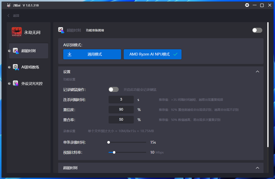 目前游戏加加GAMEPP已经专门针对AMD处理器内建的NPU研发了很多游戏功能。例如可以通过NPU检测游戏中的击杀事件并保存为超能时刻,还可以让AI做专门的蓄力训练。