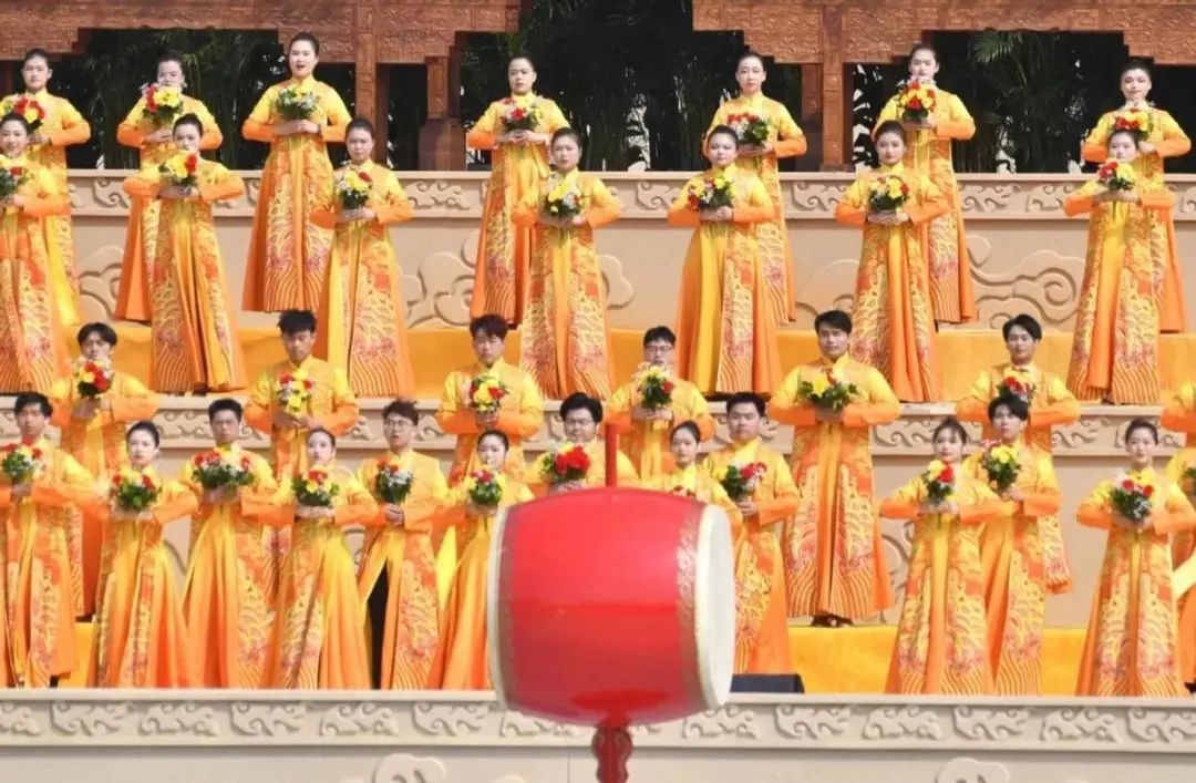 大典共有九项仪程,分别是:盛世礼炮、敬献花篮、净手上香、共拜始祖、恭读拜文、高唱颂歌、乐舞敬拜、祈福中华、天地人和。
