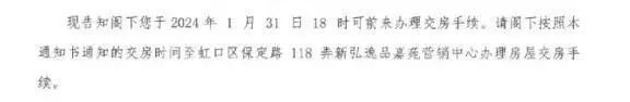 而弘久新弘北外滩却是,2024年1月31日下午5点通知业主收房,下午6点开始交房(合同要求提前10天通知),且当天没办理交房的话,房企风险责任自动转移给业主。